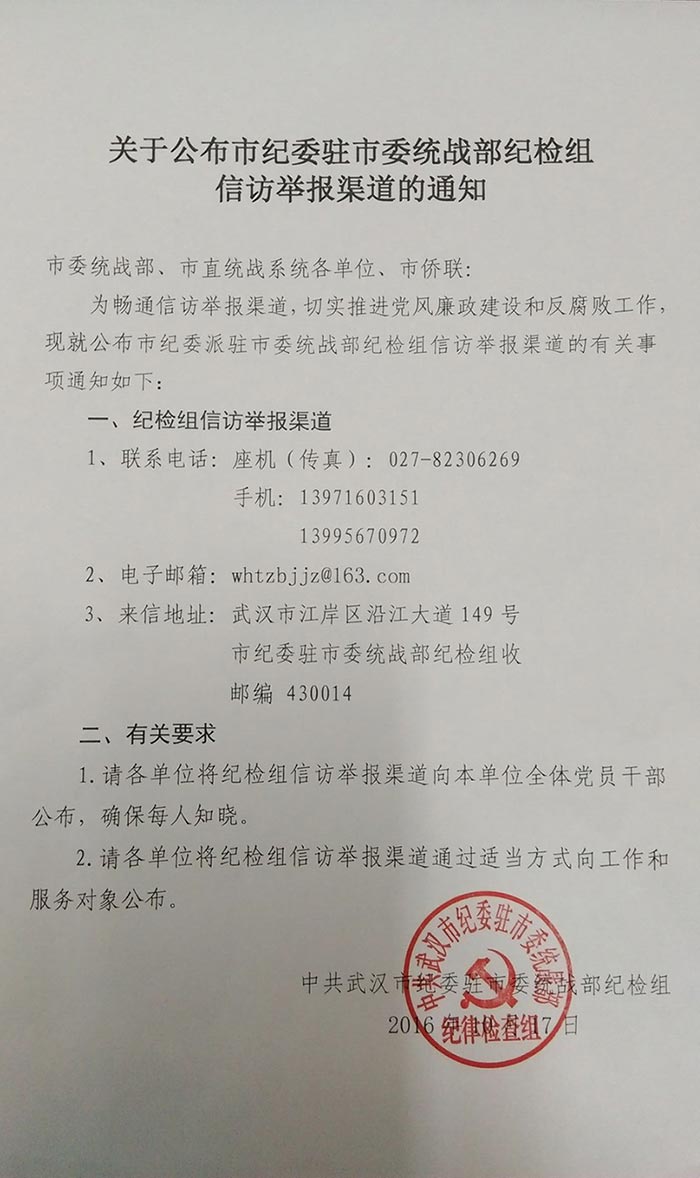 关于公布市纪委驻市委统战部纪检组信访举报渠道的通知