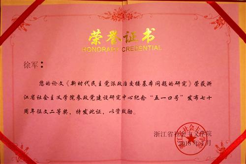 中共浙江省委统战部副部长,浙江省社会主义学院党组书记、常务副院长吴振宇到会祝贺,并致欢迎词?;嵋檠肓苏憬≌窝Щ峄岢?、浙江大学社会科学学部主任余逊达教授等64位专家学者参加。此次会议共收到来自全国和浙江省内的征文145篇,其中获奖论文55篇。我院徐军副院长撰写的《新时代民主党派政治交接基本问题的研究》获得二等奖,容晖同志撰写的《纪念“五一口号”对新时代党外人士培训工作的意义》获得三等奖。