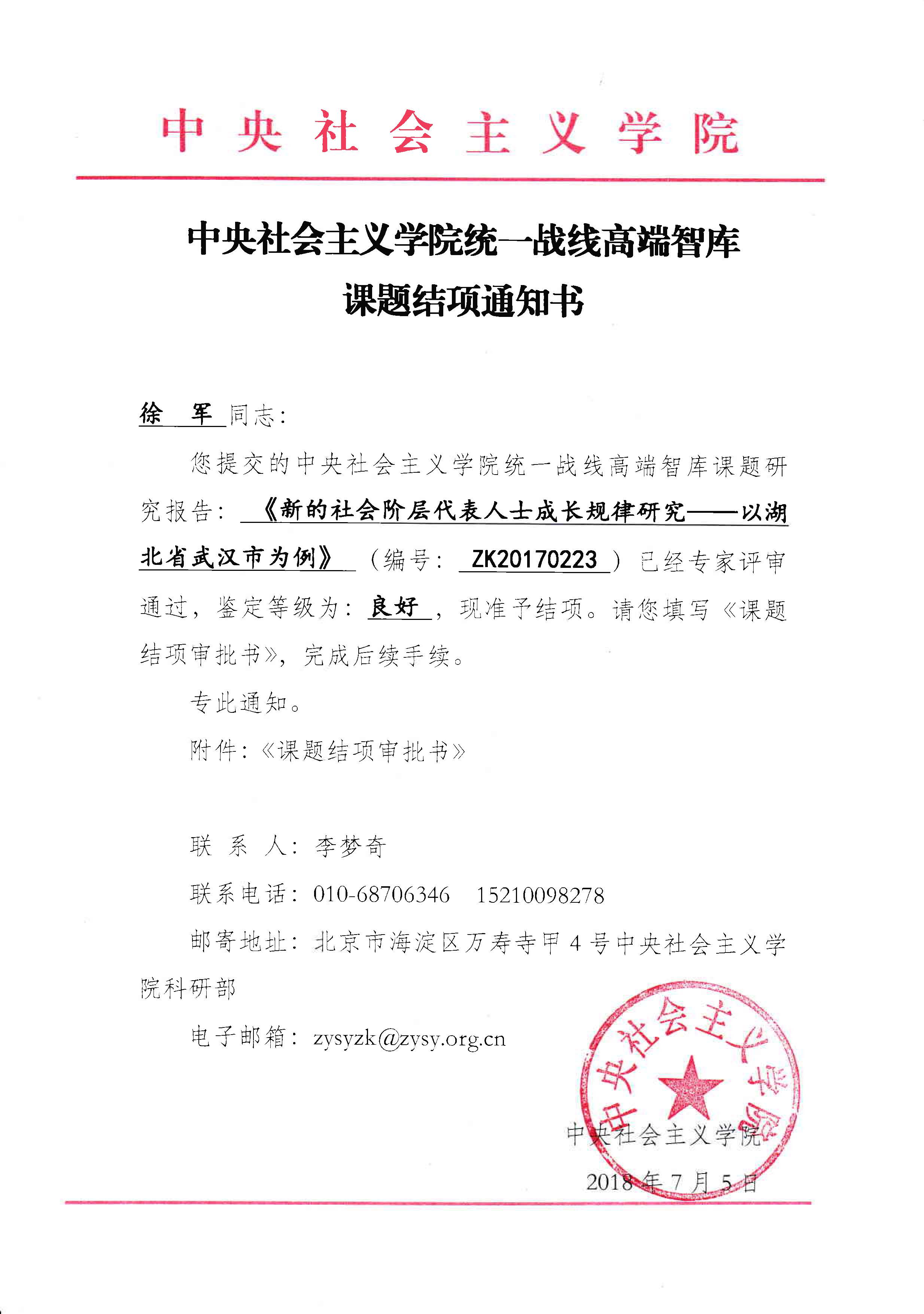 近日,市社院承接的中央社院统一战线高端智库课题“新的社会阶层代表人士成才规律研究——以湖北省武汉市为例”(课题编号 ZK20170223 )顺利结项并获良好等次,这也是市社院首次申报并获准立项的中央社院统一战线高端智库课题。