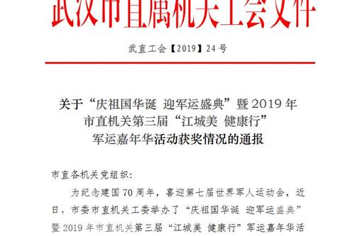 3月23日上午,庆祝祖国70华诞暨迎军运2019年市直机关第三届“江城美、健康行”军运嘉年华运动会在武汉市财政学校体育场举行,来自市直系统87个单位、1200余名选手同台竞技。我院选手分别获得“旗”心协力赛和模拟射击赛2个三等奖。