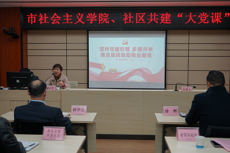 3月19日,武汉市社会主义学院联合珞珈山街道武大文理学部社区、省军区社区,台北街道云林社区,花桥街道田园社区等四个社区,共同开展“党建工作与基层治理”共建大党课,特邀全国志愿者先进个人、湖北省“百优”社区工作者、湖北省优秀社区党支部书记、武汉市人大代表、江汉区唐家墩街道西桥社区党委书记董守芝作《坚持党建引领 多措并举 推进居民自助物业服务》辅导报告,将党史学习教育融入基层党建、文明共建、社区治理等领域,做到学用结合、办实事与解难题相结合,推进党史学习教育往深里走、往实里走。