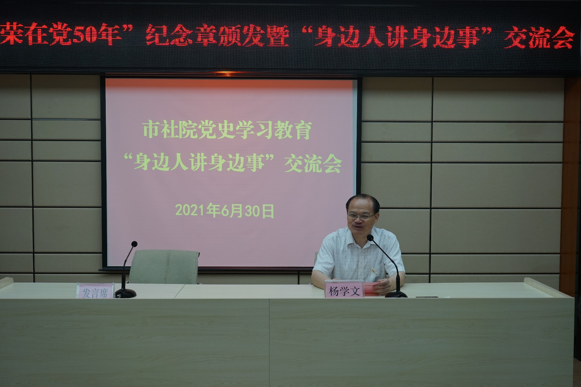 杨学文发表了热情洋溢的讲话。他指出,荣获“光荣在党50年”纪念章的老党员老同志们,忠心向党50年,把青春年华奉献给了党和人民的事业,奉献给了武汉市社院和统一战线事业,为“英雄的城市 英雄的人民”增光添彩,留下了武汉百年党史的重要篇章,他们的优良传统和奋斗精神,值得我们好好学习和继承发扬。他强调,心中有信仰,脚下有力量。在职和退休党员要永远信党爱党为党,做好“传帮带”,传承红色基因,赓续共产党人精神血脉。身边有榜样,社院有希望。市社院有很多先进的同志,大家要多向身边先进典型学习,不断汲取正能量和前进的动力。全院党员和干部职工要高标准、严要求,为争创市级模范机关、省级文明单位,促进市社院高质量发展再努力再拼搏。党员干部要认真贯彻党的十九大和党的十九届四中、五中全会精神,宣讲好“四史”,特别是在全社会“社会主义发展史”宣传教育工作中,发挥独特职能优势,按照党史学习教育时间节点,落实好各项教育任务,要着眼建设现代化大武汉特别是在探索超大城市治理现代化建设的路上,发挥新型智库作用,多思考、多献智、多出力,为百年大党续写新的辉煌!