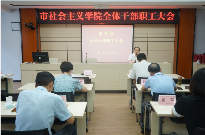 9月3日上午,市社会主义学院召开全院干部职工大会,传达市委和市委统战部工作推进会精神,部署推进落实新学期工作。党组副书记、副院长杨学文主持会议,听取了办公室、机关党委、教务处、教研室、总务处负责人关于前期工作情况和九月份工作计划的汇报?;嵋槌浞挚隙烁鞔κ仪凹父鲈碌墓ぷ?,特别是对全体干部职工放弃暑期休假,积极参与新冠疫情常态化防控,圆满完成院内值守和社区下沉各项任务表示肯定。