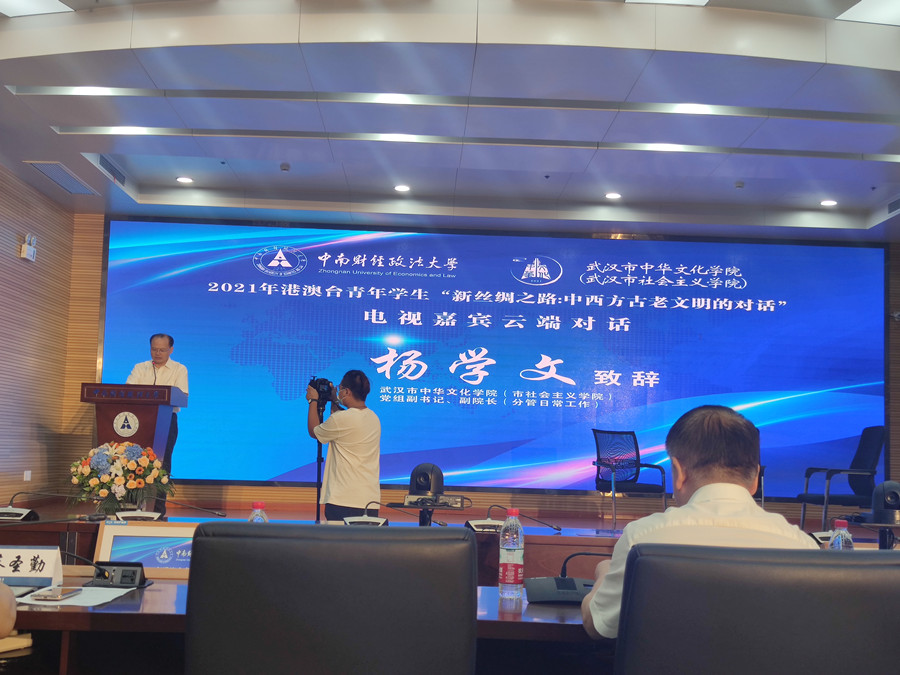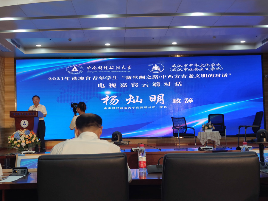 2021年9月27日下午,中南财经政法大学、武汉市中华文化学院(武汉市社会主义学院)共同开展2021年港澳台青年学生“新丝绸之路:中西方古老文明的对话”电视嘉宾云端对话。中南财经政法大学党委副书记、校长杨灿明,武汉市中华文化学院(武汉市社会主义学院)党组副书记、副院长(分管日常工作)杨学文出席并致辞。中南财经政法大学港澳台青年学生、外国留学生参加会议。