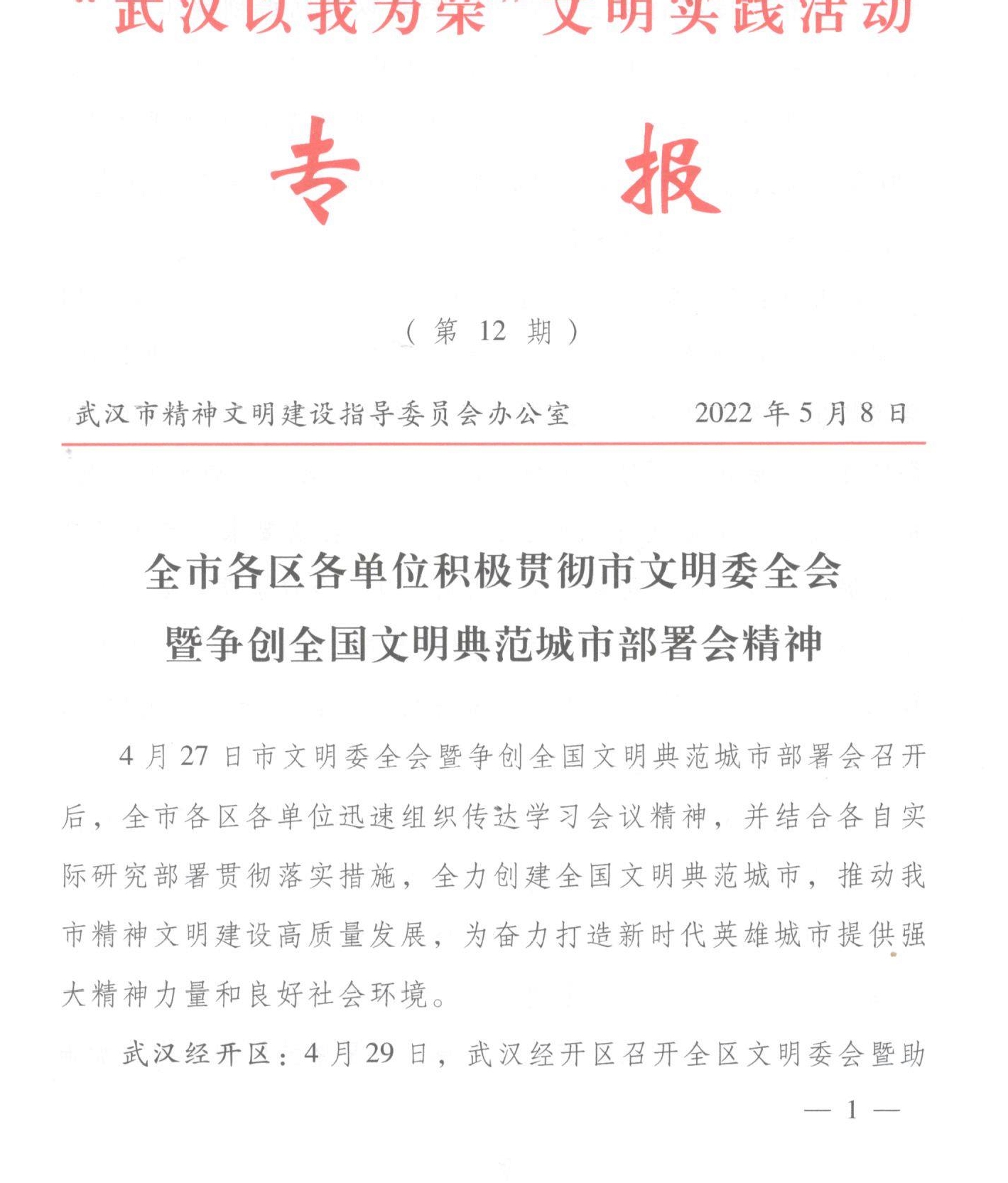 武汉市文明委《“武汉以我为荣”文明实践活动专报》刊载我院贯彻落实全市争创全国文明典范城市精神做法