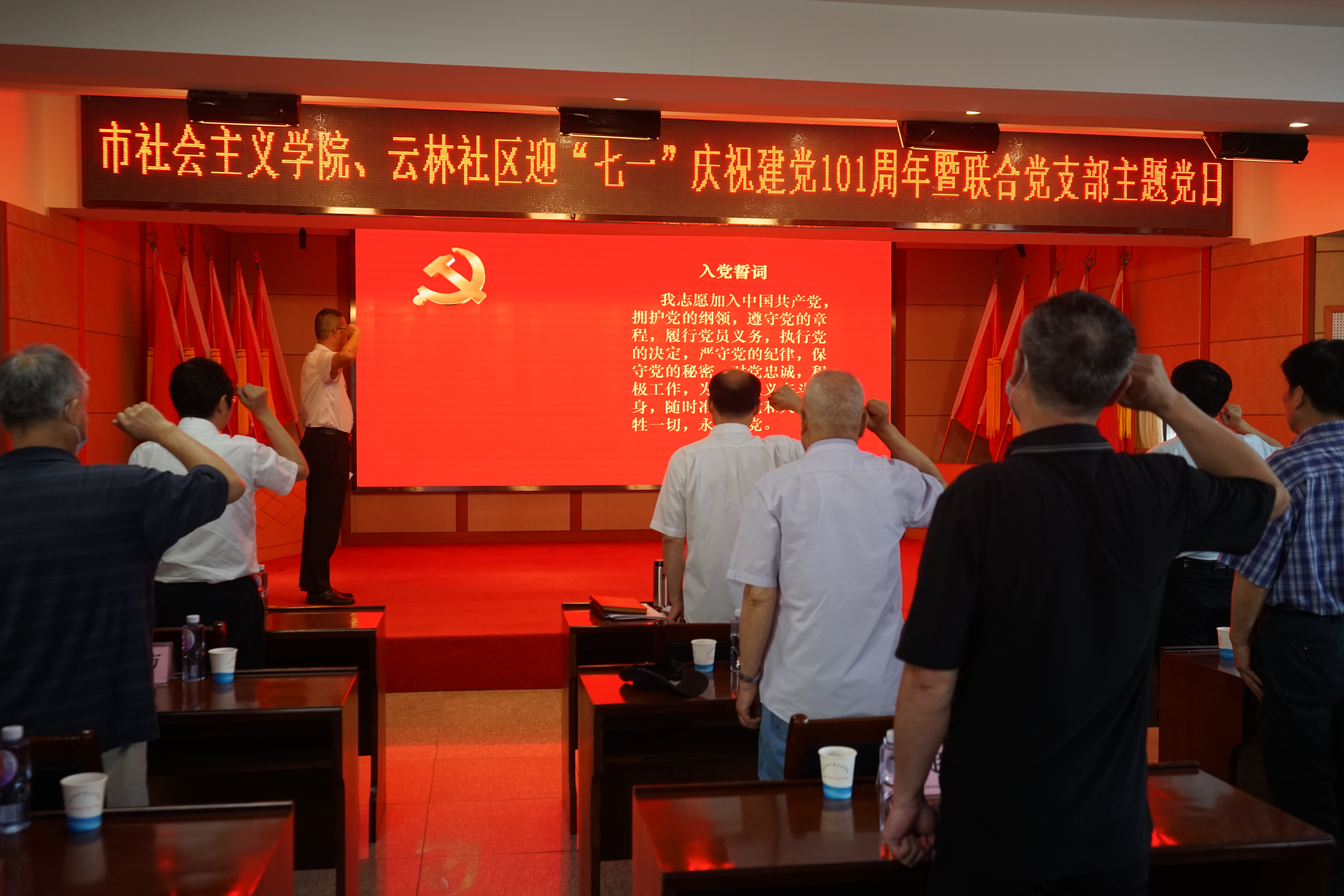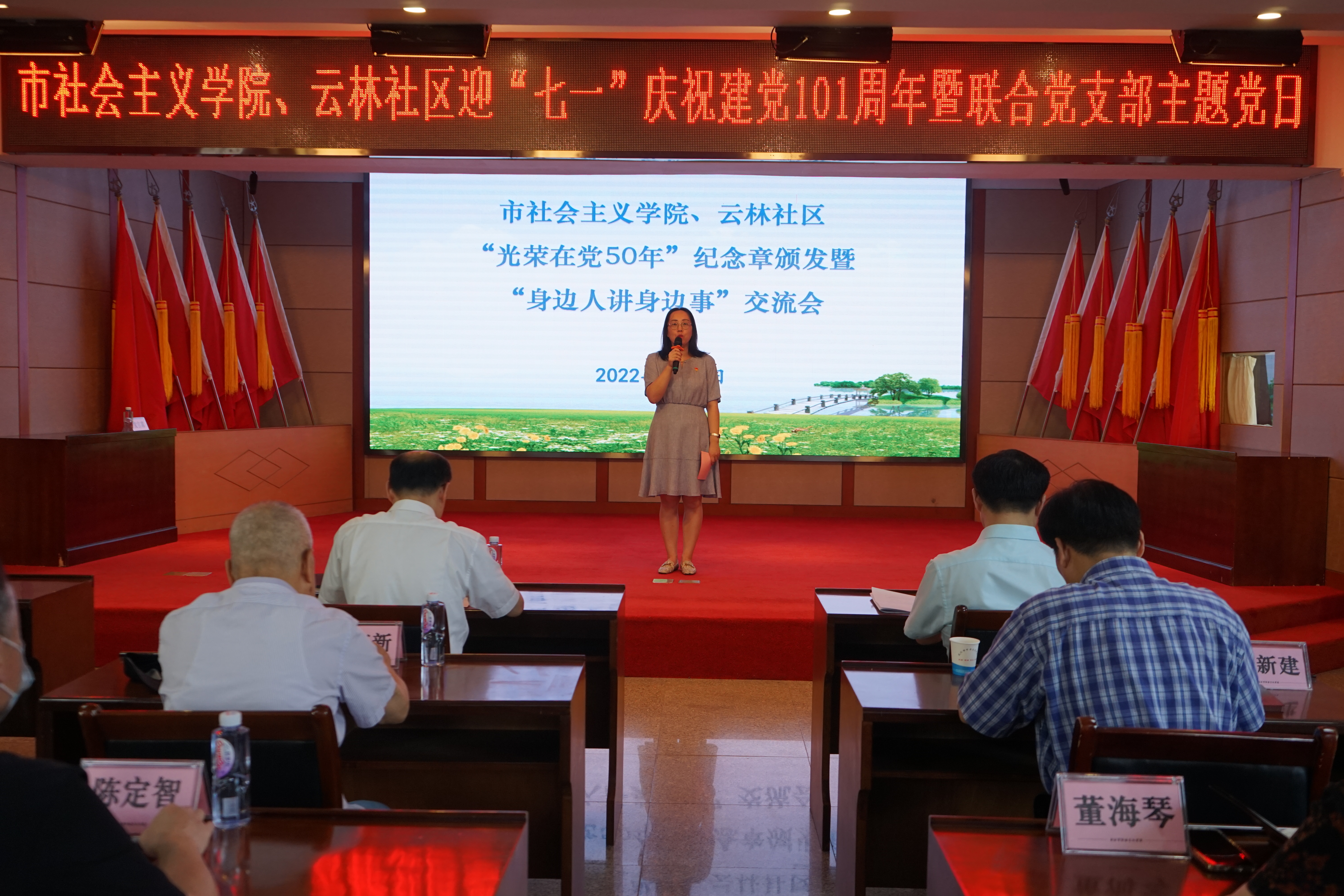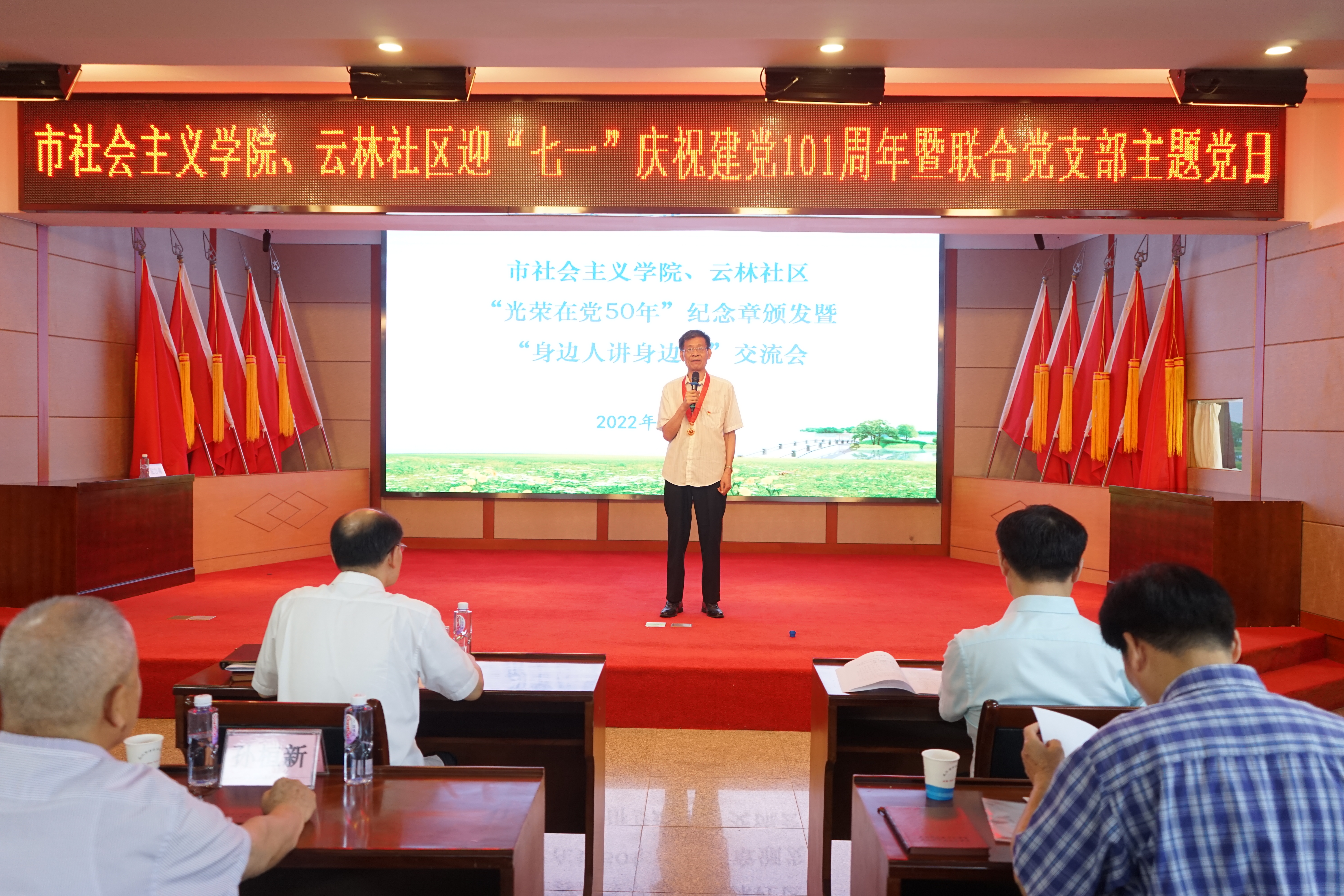 7月1日,市社会主义学院举办庆祝建党101周年联合党支部主题党日暨“身边人讲身边事”交流会。市社会主义学院综合党支部、业务党支部、老干党支部党员,云林社区党员代表共45人参加。