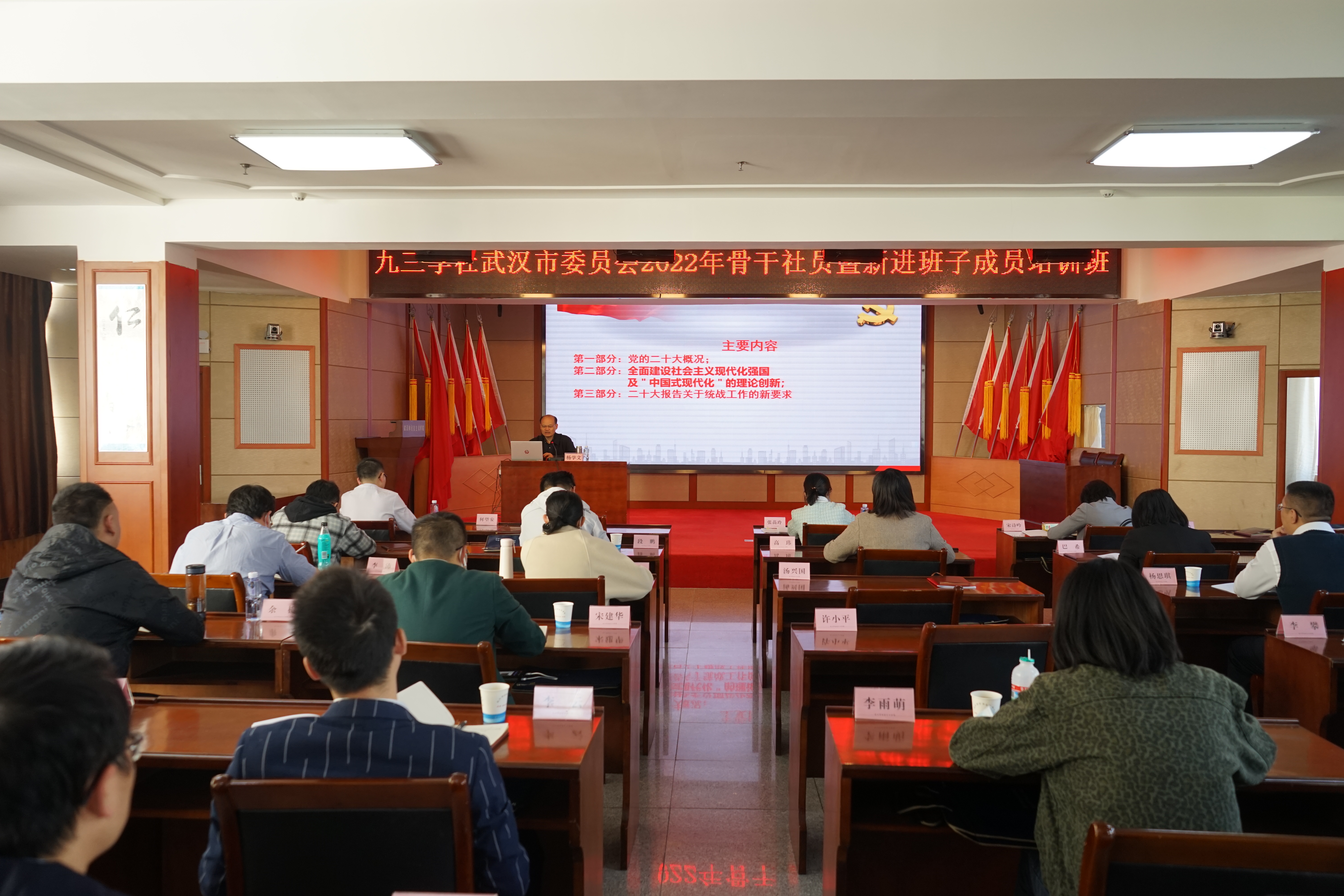 10月18日,武汉市社会主义学院党组副书记,分管日常工作的副院长杨学文以“全面建设社会主义现代化强国的政治宣言和理论纲领--党的二十大报告及‘中国式现代化’的理论创新”为题为九三学社武汉市委员会2022年骨干社员暨新进班子成员培训班学员宣讲党的二十大精神。