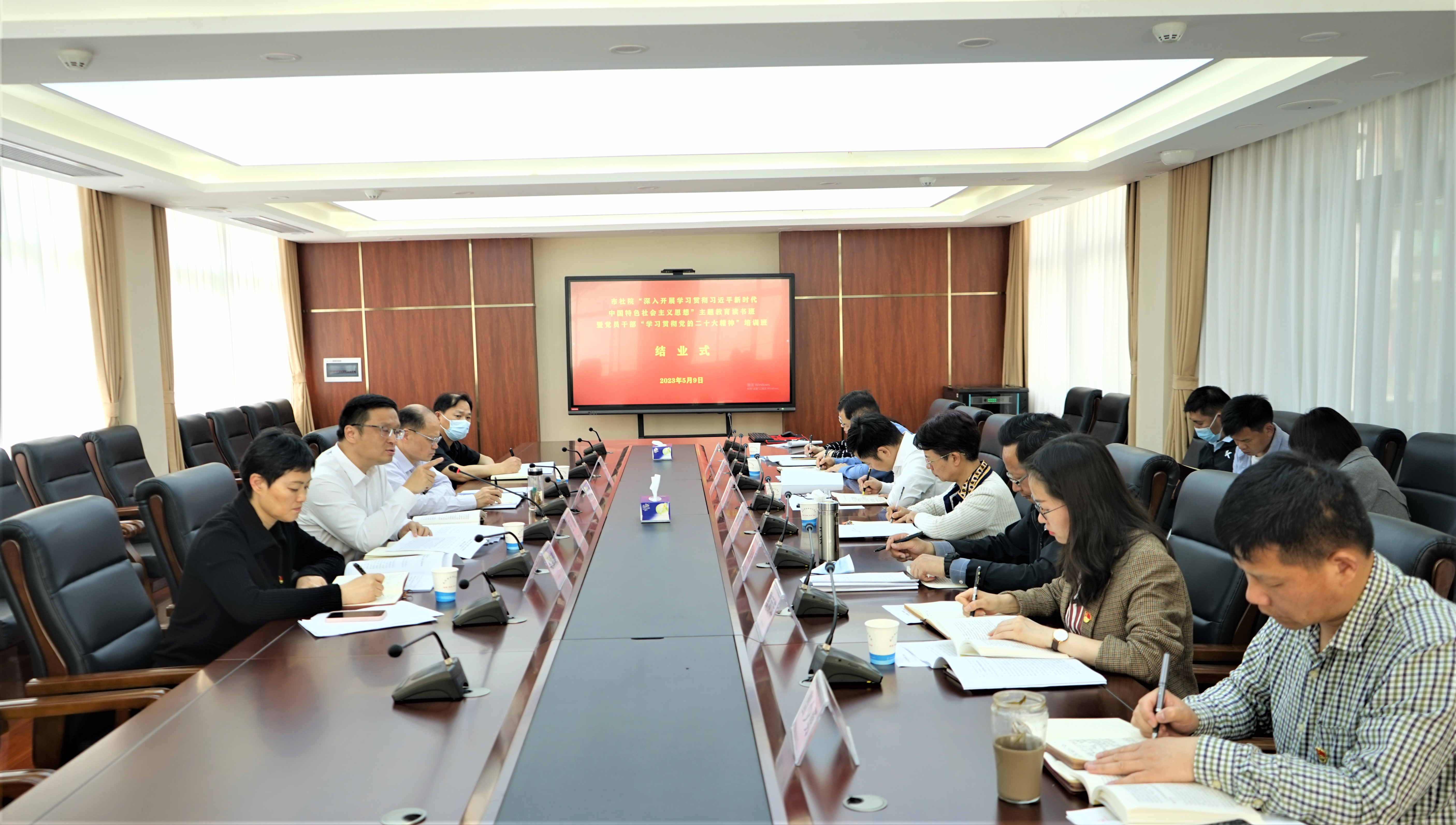 4月26日至5月9日,武汉市社会主义学院举办学习贯彻习近平新时代中国特色社会主义思想主题教育读书班暨党员干部“学习贯彻党的二十大精神”培训班。中共武汉市委统战部副部长、市社会主义学院党组书记王磊出席开班式和结业式并讲话,要求党员干部全面系统深入学习贯彻习近平新时代中国特色社会主义思想和党的二十大精神,充分发挥社会主义学院统一战线教育培训“主阵地”作用,筑牢信仰之基、锤炼忠诚品格,实干担当作为,践行宗旨为民,坚定拥护“两个确定”,坚决做到“两个维护”。学院党组副书记、副院长杨学文,党组成员、副院长梁海涛,以及全体党员干部参加读书班活动。