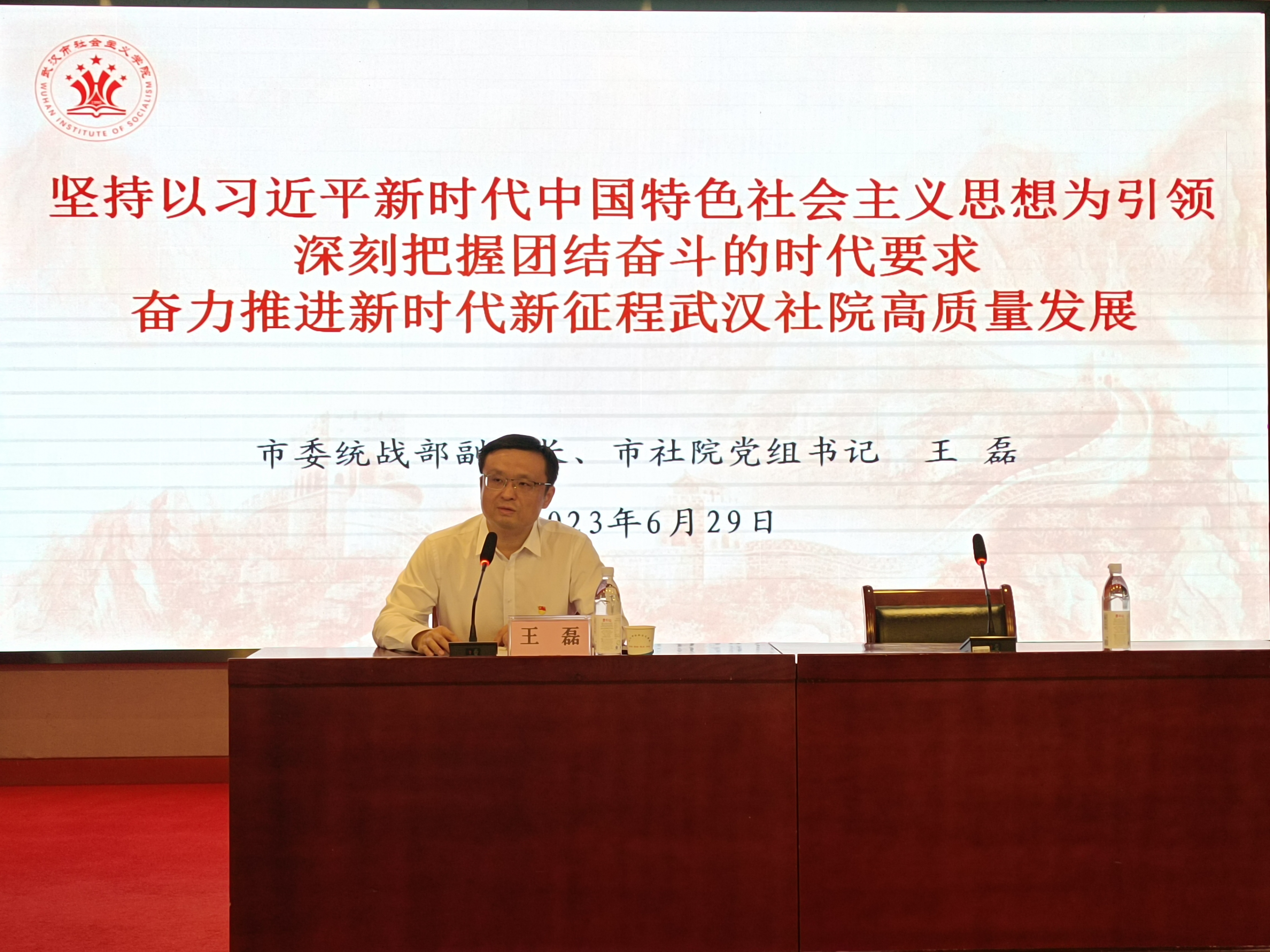王磊从“深刻领会党的创新理论活的灵魂,用习近平新时代中国特色社会主义思想凝心铸魂;深刻理解统一战线与马克思主义中国化时代化‘两个结合’的互动与演进关系;深刻把握团结奋斗的时代要求,奋力谱写新时代武汉社院统一战线教育培训事业新篇章”等三个方面内容,讲清了如何理解和运用习近平新时代中国特色社会主义思想武装头脑、指导实践、推动工作,如何理解把握统一战线与马克思主义中国化时代化“两个结合”的关联关系、如何以党的二十大报告中提出的“团结奋斗”时代要求,推进学院教学培训等各方面工作高质量发展,并提出“六个下功夫”要求。即“持续在深入学习上下功夫、持续在思想引领上下功夫、持续在宣传阐释上下功夫、持续在推进中华文化教育研究和传播方面下功夫、持续在服务统战工作大局方面下功夫、持续在改进工作作风方面下功夫”。