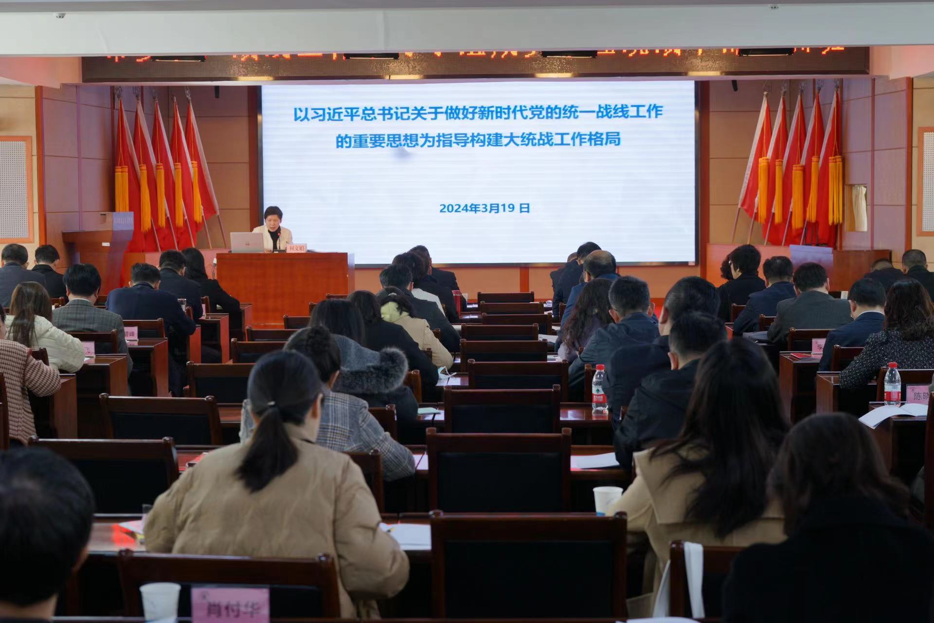 为深入学习贯彻习近平总书记关于做好新时代党的统一战线工作的重要思想和市委统一战线工作领导小组会议精神,提高领导小组工作效能,巩固发展大统战工作格局,3月19日—20日,市委统一战线工作领导小组成员单位统战干部培训班在市社院举办。市社会主义学院一级巡视员杨学文、市委统战部副部长何文娟出席开班式并讲话。市委统一战线工作领导小组成员单位分管领导和联络员、各区(开发区、功能区)党委(工委)统一战线工作领导小组办公室负责人共67人参加培训。