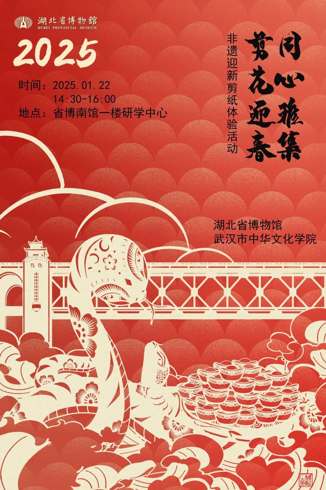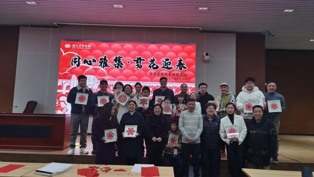 活动现场,湖北省博物馆工艺美术研究中心高级工艺美术师、省级非物质文化遗产传承人蔡骁龙老师,带领志愿者团队,悉心指导20多名参与者学会工具使用及折纸剪纸的技巧,引导大家在全心投入、精心雕琢中感悟剪纸文化的独特意趣,创作出一幅幅吉祥喜庆、精妙绝伦的剪纸作品,为即将到来的新年营造了浓厚的节日氛围。