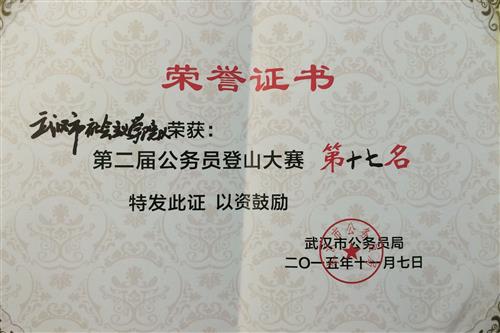 11月7日,由武汉市人民政府主办,黄陂区人民政府、武汉市人力资源和社会保障局、武汉市体育局承办的“武汉市第二届公务员健身登山大赛”在黄陂木兰山风景区拉开帷幕。各区、管委会,市直党政机关、事业单位,各民主党派、群众团体近400个单位和组织,2000余人参加了此次活动。我院代表队,耗时1小时16分6秒跑完全程总长10.7公里山道,一举夺得全市团体组第17名的好成绩(奖励前20名)。