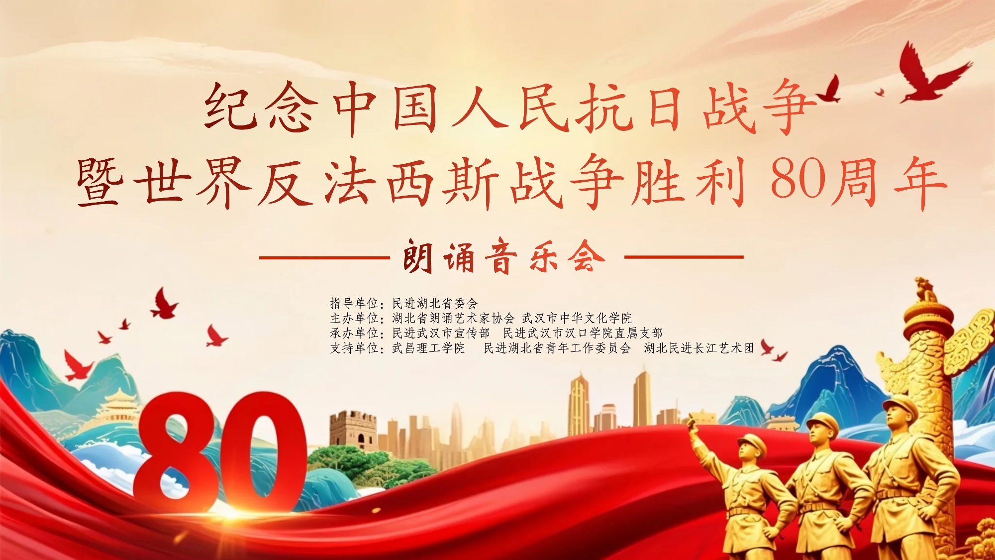 9月6日,“纪念中国人民抗日战争暨世界反法西斯战争胜利 80 周年朗诵音乐会”在湖北省民主党派大楼报告厅举行。本次活动由民进湖北省委指导,湖北省朗诵艺术家协会、武汉市中华文化学院主办,全国人大代表、民进湖北省委副主委、中南财经政法大学教授叶青,武汉市中华文化学院党组成员、副院长梁海涛出席,相关教育、文化届代表近100余人参与。
