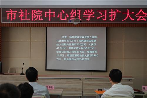 5月31日,市社院党组书记刘善明主持召开党组中心组学习扩大会议?;嵘希旱匙槌稍?、副院长徐军等同志先后传达了市委办公厅下发的《武汉市推进领导干部能上能下实施办法(试行)》、《关于认真组织学习中办发电〔2016〕9号文件的通知》等文件、2016年度全市纪检监察机关执纪审查工作会议暨业务培训班精神,最后全体干部职工观看了电视教育片《岂容蚁穴毁巨堤--小官贪腐警示录》。