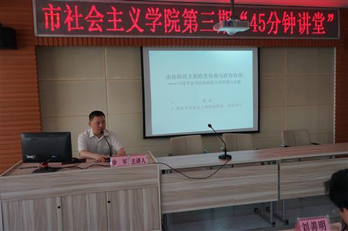 6月8日下午,市社会主义学院本学年第三期“45分钟讲堂”由徐军副院长主讲,他以“由协商民主到政党协商和政协协商——习近平总书记协商民主的思想与实践”为题,从“魂”“本”“形”的逻辑关系,阐述了习近平总书记关于协商民主的新思想、中共中央关于社会主义协商民主建设的《意见》的新内容、政党协商和政协协商的新地位,结构清晰、内容详实,深入浅出地为大家上了一堂精彩的统战理论报告,这是本院根据“两学一做”要求,结合本院实际开展的又一创新活动。
