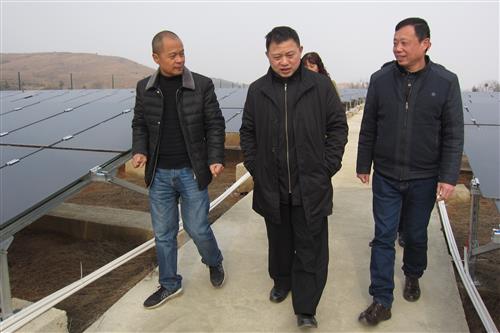 由帮扶单位援建的寨东村80千瓦光伏发电站,坐落在村前一处南北朝向的荒坡,占地面积2200平米,采光极好,效率极高。来到光伏发电现场,那一排排整齐划一的薄膜方阵,就像一个个等待检阅的威严士兵,在阳光的映衬下熠熠生辉,你甚至都能感受得到它们的脉动。徐院长一边观看,一边倾听村支书王卫国和驻村书记余玉彬,对今年集体经济项目的推进情况,以及扶贫工作中存在的各种问题的汇报。