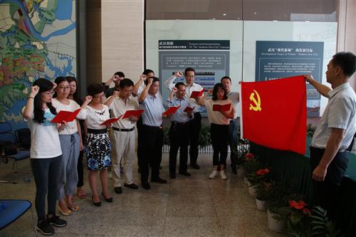 在武汉规划展示馆里,院党组书记刘善明、副院长徐辉、徐军和学院全体党员干部一道,佩戴党徽,面对神圣的党旗,高举右拳,重温入党誓词。宣誓活动结束后,全体党员干部一起参观了武汉规划展示馆。