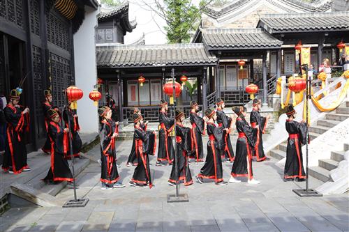 上午9时,伴随着隆隆鼓声和乐声,问津书院的朱红色大门缓缓打开,祭孔大典正式开始。在主祭官、分献官、陪祭官的带领下,身着红色、黑色汉服的40余名礼仪人员排成两列,拾级而上,缓缓进入问津书院,依次穿过书院讲堂,最后来到大成殿,面向孔子铜像行祭拜礼。祭孔典礼结束后,大家兴致盎然地参观了大成殿、讲堂以及孔子山。