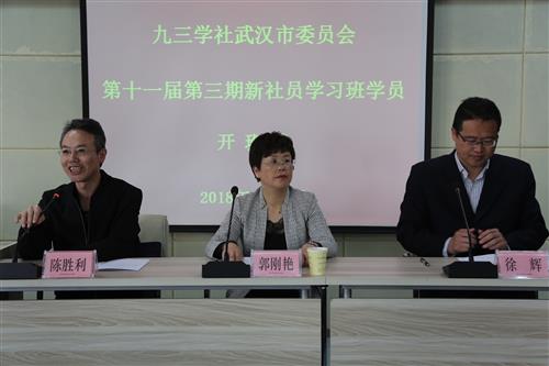 ? 4月10日,九三学社武汉市委第十一届第三期新社员学习班在市社会主义学院举行,53位九三学社新社员参加了此次培训。九三学社市委秘书长陈胜利主持开班式,九三学社市委副主委郭刚艳、市社会主义学院副院长徐辉出席开班式并讲话。