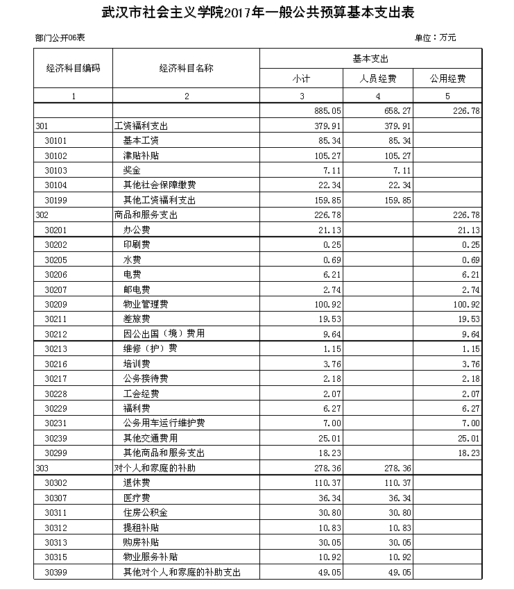 武汉市社会主义学院2017年一般公共预算基本支出表