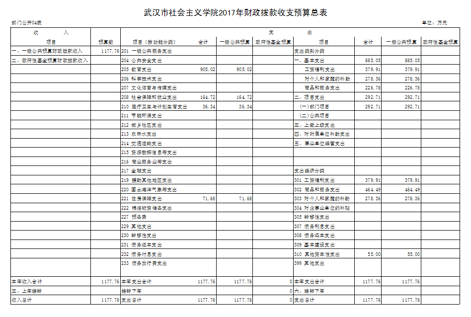 武汉市社会主义学院2017年财政拨款收支预算总表