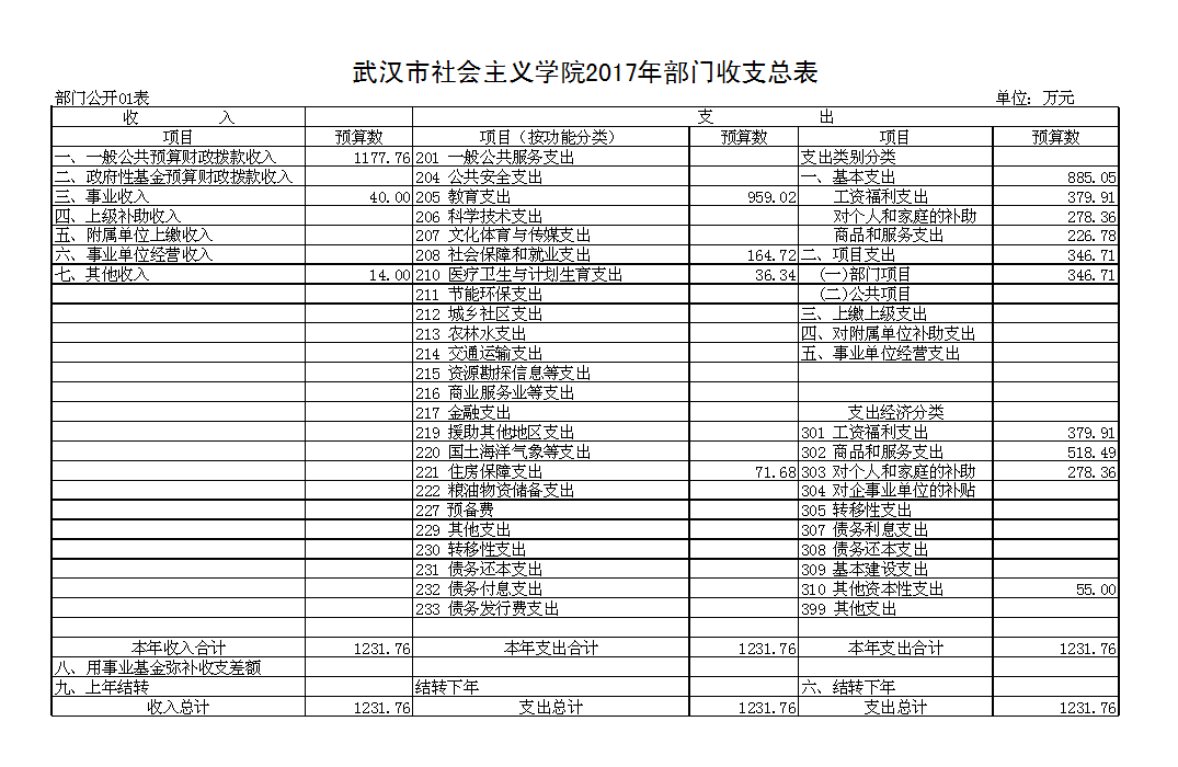 武汉市社会主义学院2017年部门收支总表