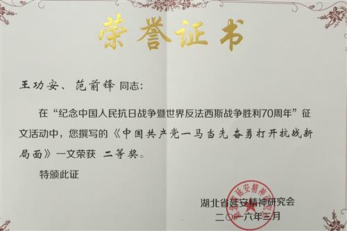 ? ? 在湖北省延安精神研究会发起的“纪念中国人民抗日战争暨世界反法西斯战争胜利70周年”征文活动中,我院老院长王功安研究员和教研室范前锋副研究员合作撰写的《中国共产党一马当先?奋勇打开抗战新局面》一文荣获二等奖。